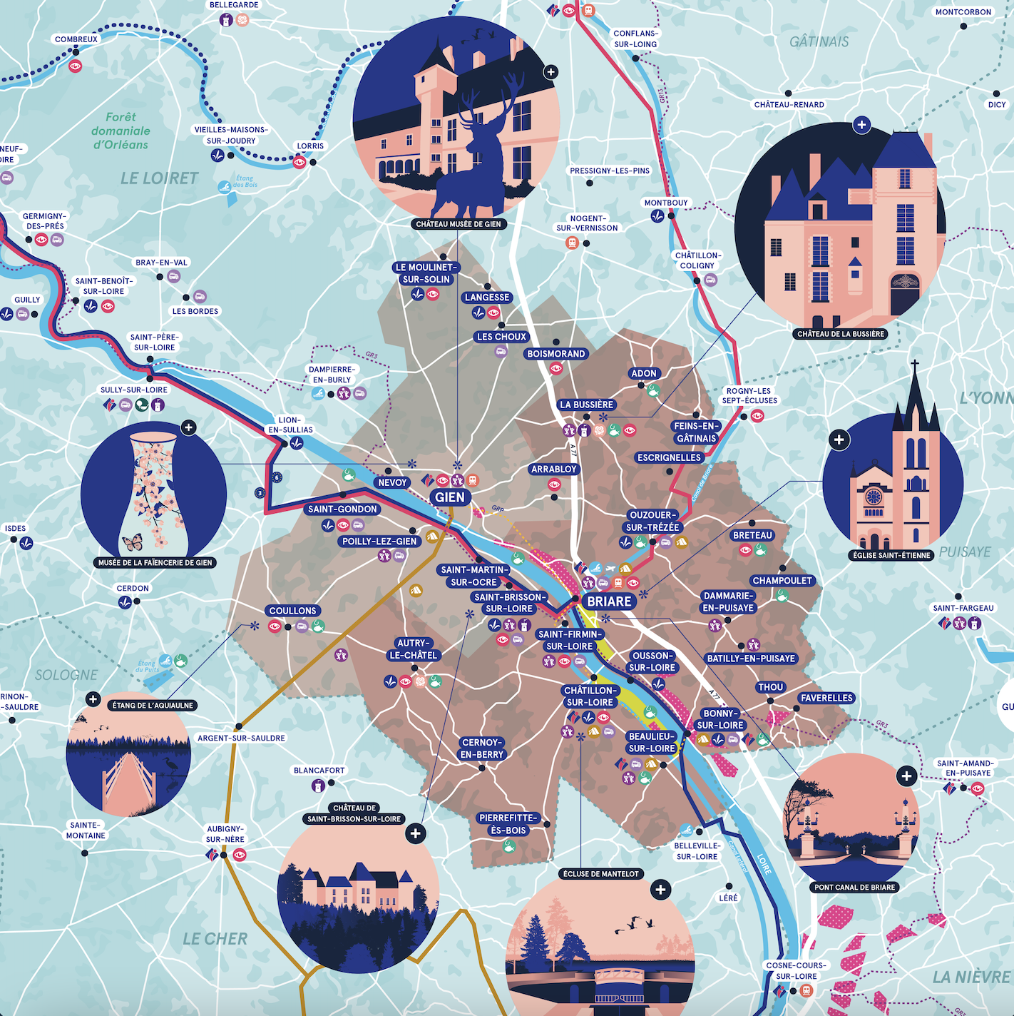 Un travail minutieux pour nos créa qui se sont chargés de la conception et la réalisation d’une carte touristique mettant en avant les éléments majeurs du territoire. Accompagnée d’illustrations offrant une expérience visuelle immersive et informative, cette carte est désormais disponible aux Offices de Tourisme de Gien et de Terres de Loire et Canaux et certainement ailleurs aussi…